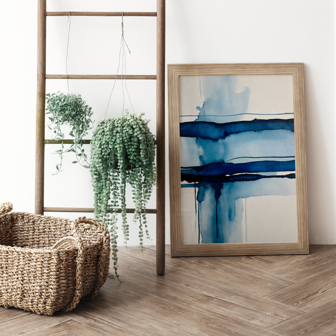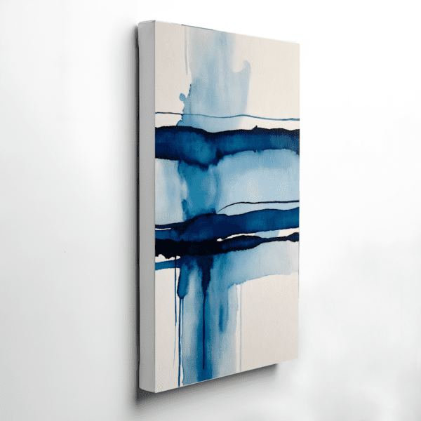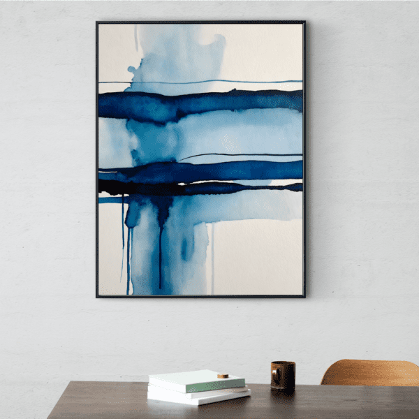 This image showcases an abstract painting characterized by beautiful interactions of blue tones; it’s compelling due to its ability to evoke deep emotions and transform spaces with its ethereal presence.