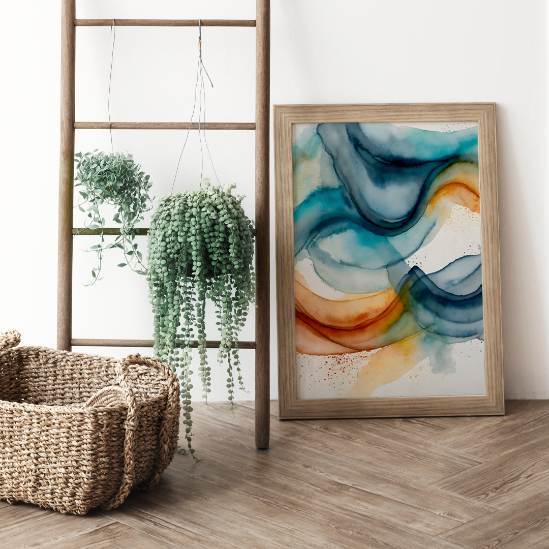 “The ‘Dance of the Tides’ is not just a painting; it’s an experience, a journey through unknown seas and uncharted skies. Each meticulously applied brushstroke weaves a visual narrative that challenges perception and evokes a profound sense of awe. The blue tones, reminiscent of the infinite ocean, harmoniously blend with golden and terracotta hues that invoke the majesty of dawn. This masterpiece is not confined by the limits of the frame; it transcends the canvas to immerse the viewer in a world where art and emotion converge. Acquiring the ‘Dance of the Tides’ is not merely obtaining a piece of art; it’s inviting a slice of the ethereal cosmos into your personal space, transforming every gaze into a visual odyssey that lingers long after one looks away. Discover the visual symphony that has captivated critics and art enthusiasts alike; make this unique piece yours today at Printzzy.com.”