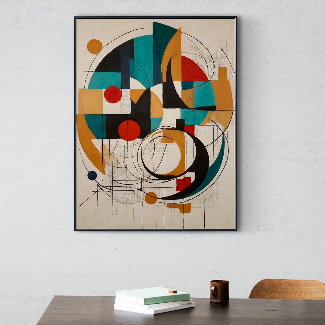 At PRINTZZY.COM, we pride ourselves on presenting works that not only beautify spaces but also provoke reflection. ‘Geometric Harmony’ is more than a painting; it is a visual dialogue where each shape and color tells a unique story, inviting the viewer to get lost in its intricate dance. Acquire this exclusive piece and transform your space into a private gallery of modern sophistication and timeless style.”