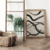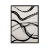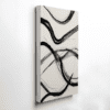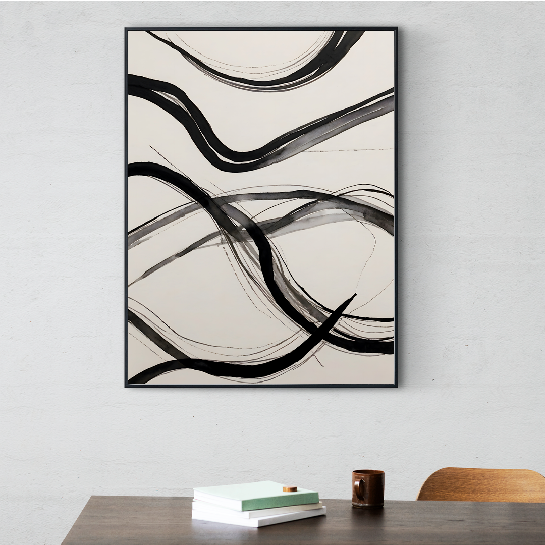 This image shows an abstract painting characterized by flowing black lines against a white background creating an elegant yet dynamic visual experience that captivates viewers with its balance between motion and stillness.